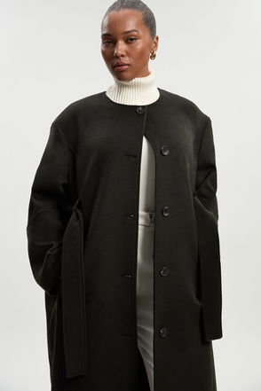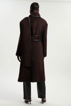 Brushed Wool Pu Mix Scarf Neck Belted Tailored Maxi Coat