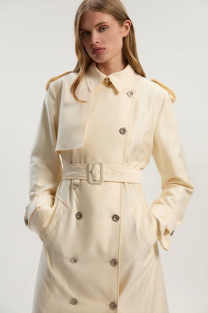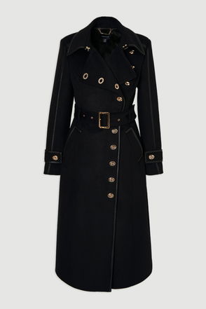 Brushed Wool Pu Mix Gold Trim Belted Midi Coat