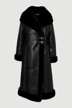 Faux Shearling Oversize Collar Buckle Midi Coat