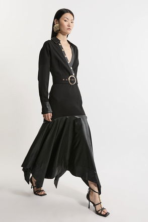Belted Pu And Ponte Jersey Frill Hem Midi Dress