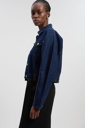 Denim & Faux Leather Tipping Collarless Tailored Jacket