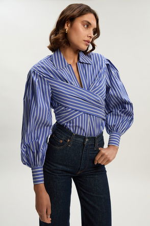 Stripe Cotton Poplin Drama Sleeve Woven Wrap Detail Blouse
