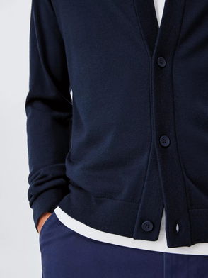 Merino Wool Saddle V-Neck Cardigan, Dark Sapphire
