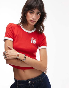 Crop Ringer Tee With Small Graphic In Red