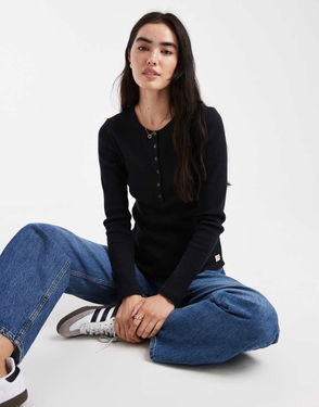 Waffle Henley Long Sleeve Top In Black