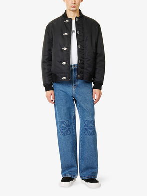 De-Bossed Logo Ribbed-Trims Leather Bomber Jacket