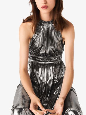Ruffled V-Neck Metallic-Woven Maxi Dress
