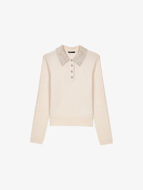 Rhinestone-Collar Stretch Wool-Blend Polo