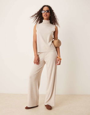 Light Weight Knitted Trouser Co-ord In Light Beige