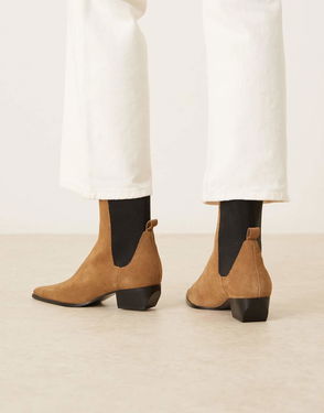 Suede Square Toe Low Heeled Western Ankle Boot In Latte