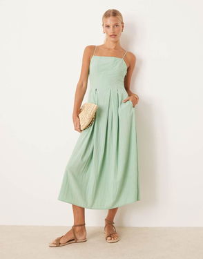Cotton Mix Sleeveless Pleat Detail Mini Dress In Khaki