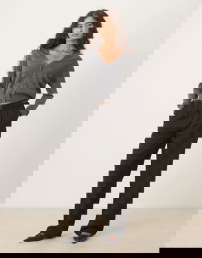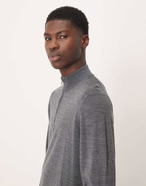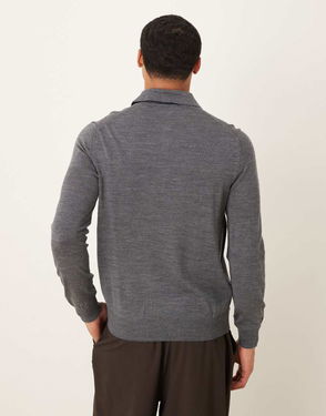 Wool Button Up Long Sleeve Knitted Polo Top In Charcoal