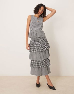 Cotton Rich Square Neck Mini Dress In Black And White Mono Gingham Check