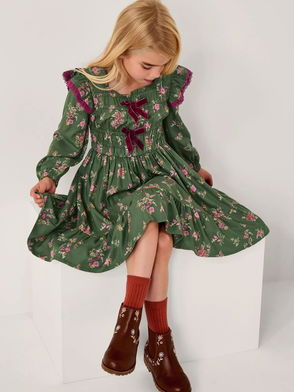 Kids' Long Sleeved Butterfly And Floral Print Dress, Green