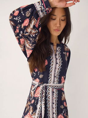 Sylvia Floral Fitted Satin Flared Midi Dress, Navy