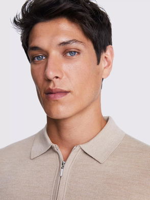 Merino Wool Blend Regular Fit Zip Neck Polo Shirt, Beige