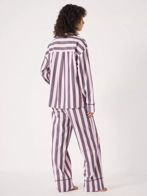 Stripe Brushed Cotton Button Through Long Pyjama Set, Purple/Pale Pink