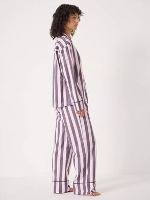 Stripe Brushed Cotton Button Through Long Pyjama Set, Purple/Pale Pink