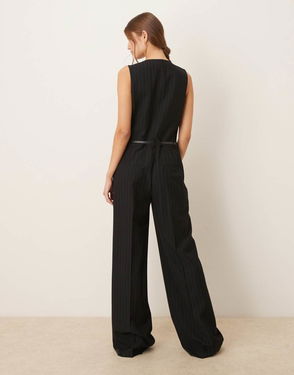 Tailored Waistcoat Jumpsuit With Belt In Navy Pinstripe