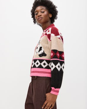 Burgundy & Cream Cat Collared Knitted Bomber Jacket
