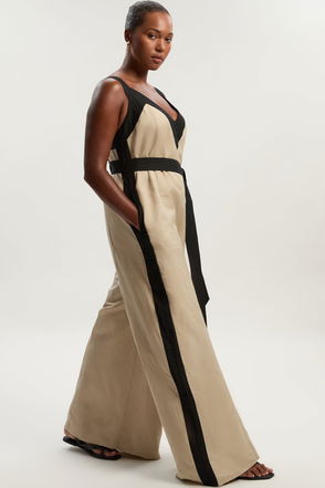 Plus Size Contrast Linen Cross Back Woven Jumpsuit