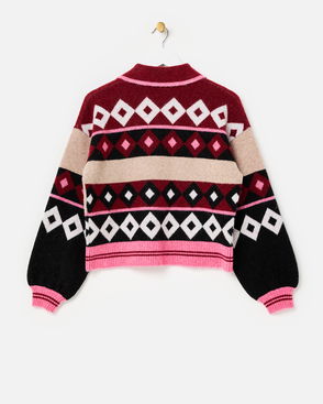 Burgundy & Cream Cat Collared Knitted Bomber Jacket