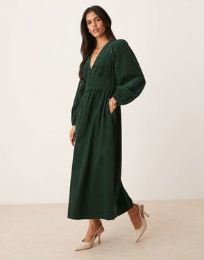 Riley Cord V-neck Midi Dress In Dark Green