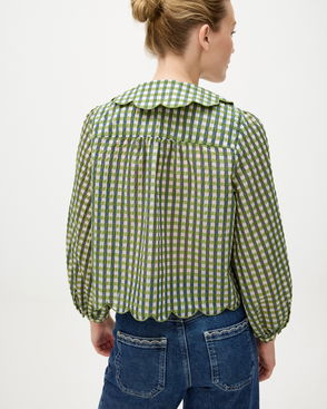 Red Gingham Shirred Puff Sleeve Collared Blouse