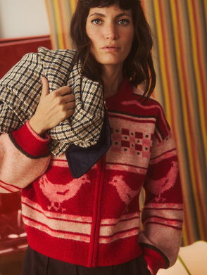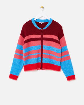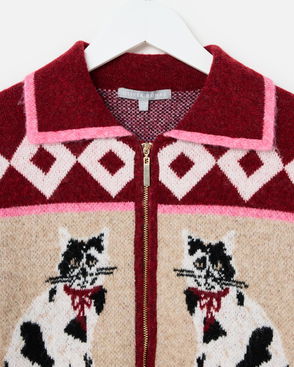 Burgundy & Cream Cat Collared Knitted Bomber Jacket