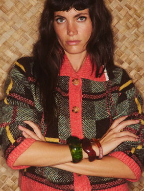 Green & Pink Checked Collared Button Up Knitted Cardigan