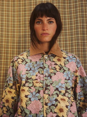 Brown & Pastel Floral Print Corduroy Collar Denim Jacket