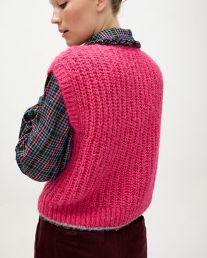Pink & Burgundy Trim V-Neck Knitted Cardigan