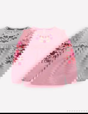 Cotton Lace Trim Short Sleeve Round Neck T-Shirt