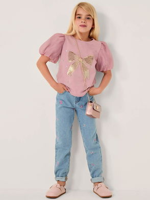Kids' Sequin Bow Puff Sleeve T-Shirt, Purple