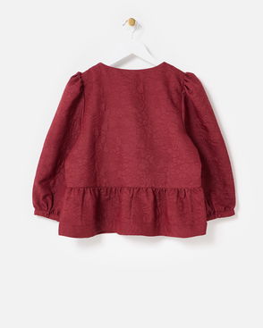 Burgundy Floral Jacquard Peplum Puff Sleeve Top