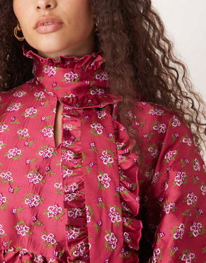 Oversized Pussybow Jacquard Mini Dress In Red Floral