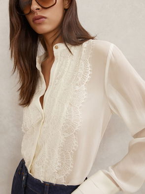 Lace-Trim Sheer Button-Through Blouse In Cream