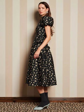 Dream Jacquard Midi Dress With Ruffle Hip Detail In Tea Rose Black Floral