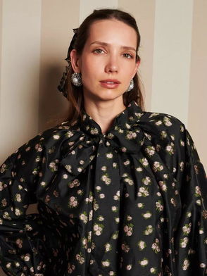 Oversized Pussybow Jacquard Mini Dress In Black Floral