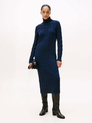 Cable Knit Midi Soft Wool Jumper Dress In Dark Blue