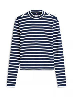 Mock Neck Slim Long Sleeve Top, Blue/White