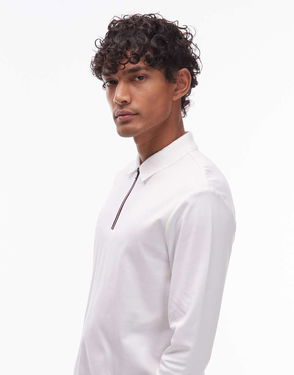Long Sleeve Herringbone Texture Polo Shirt In White
