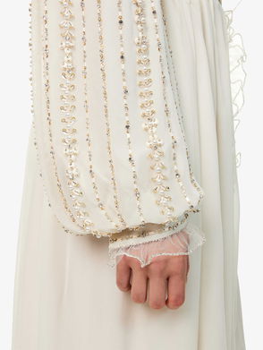 Shirred-Bodice Sheer-Sleeve Silk Gown