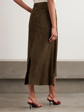 Paneled Embroidered Pinstriped Leather Midi Skirt