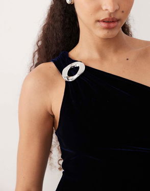 Velvet One Shoulder Jumpsuit With Hardware Detail In Navy