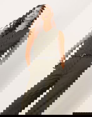 Wool Mix Tailored Belted Waistcoat Jumpsuit In Khaki