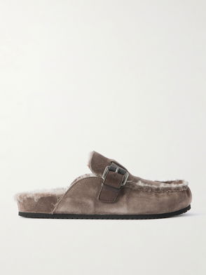 Sol Horsebit-Detailed Debossed Shearling-Trimmed Suede Slippers